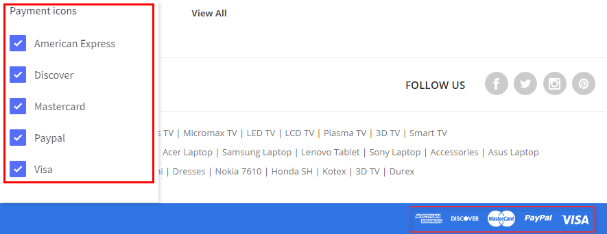 4.Footer Menus & Payment icons - This section lets you configure footer menus & playment icon (Show/Hide )