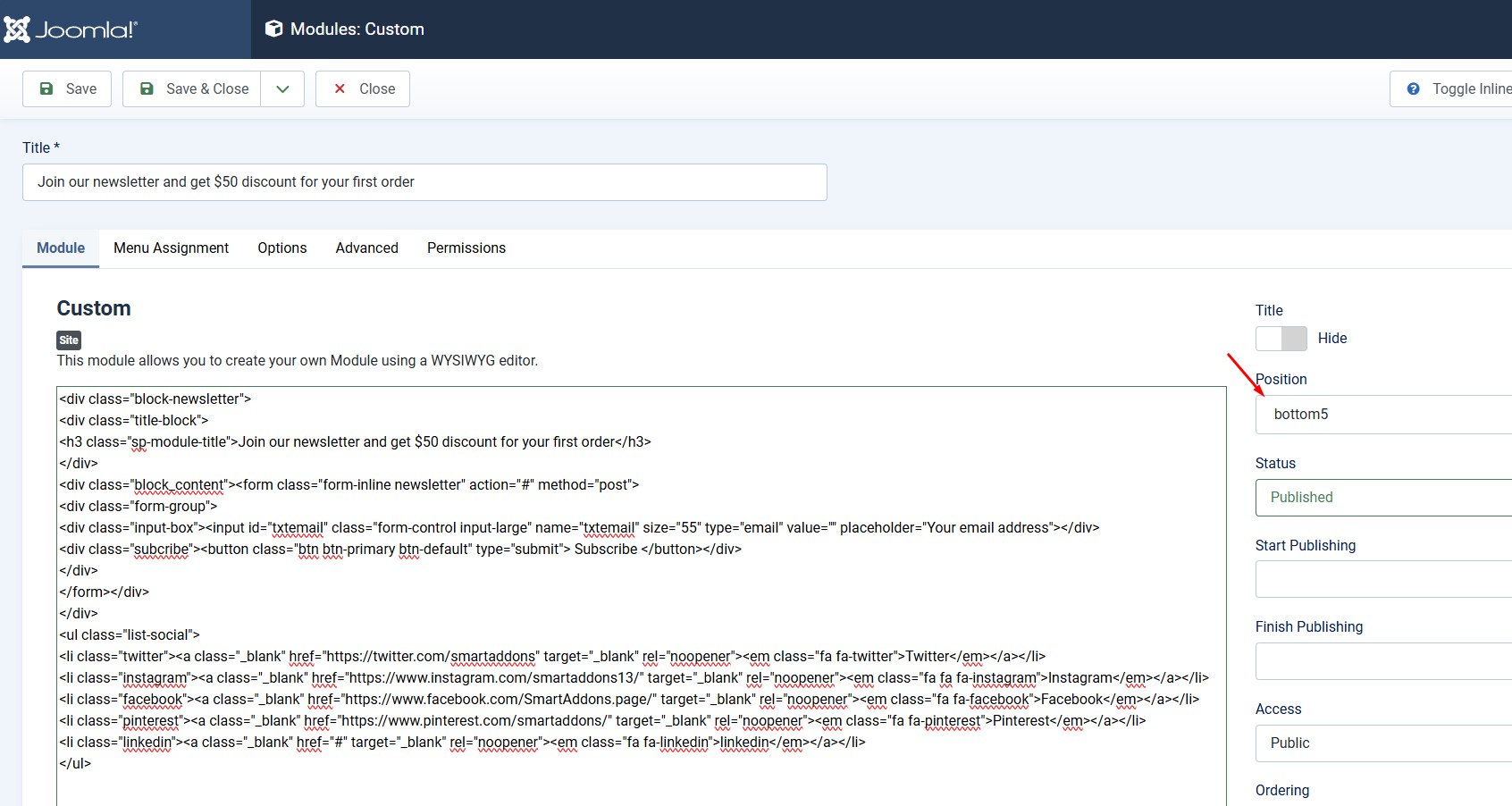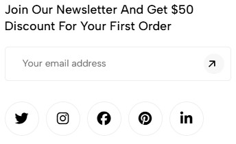 <div class="block-newsletter"> <div class="title-block"> <h3 class="sp-module-title">Join our newsletter and get $50 discount for your first order</h3> </div> <div class="block_content"><form class="form-inline newsletter" action="#" method="post"> <div class="form-group"> <div class="input-box"><input id="txtemail" class="form-control input-large" name="txtemail" size="55" type="email" value="" placeholder="Your email address"></div> <div class="subcribe"><button class="btn btn-primary btn-default" type="submit"> Subscribe </button></div> </div> </form></div> </div> <ul class="list-social"> <li class="twitter"><a class="_blank" href="https://twitter.com/smartaddons" target="_blank" rel="noopener"><em class="fa fa-twitter">Twitter</em></a></li> <li class="instagram"><a class="_blank" href="https://www.instagram.com/smartaddons13/" target="_blank" rel="noopener"><em class="fa fa fa-instagram">Instagram</em></a></li> <li class="facebook"><a class="_blank" href="https://www.facebook.com/SmartAddons.page/" target="_blank" rel="noopener"><em class="fa fa-facebook">Facebook</em></a></li> <li class="pinterest"><a class="_blank" href="https://www.pinterest.com/smartaddons/" target="_blank" rel="noopener"><em class="fa fa-pinterest">Pinterest</em></a></li> <li class="linkedin"><a class="_blank" href="#" target="_blank" rel="noopener"><em class="fa fa-linkedin">linkedin</em></a></li> </ul>