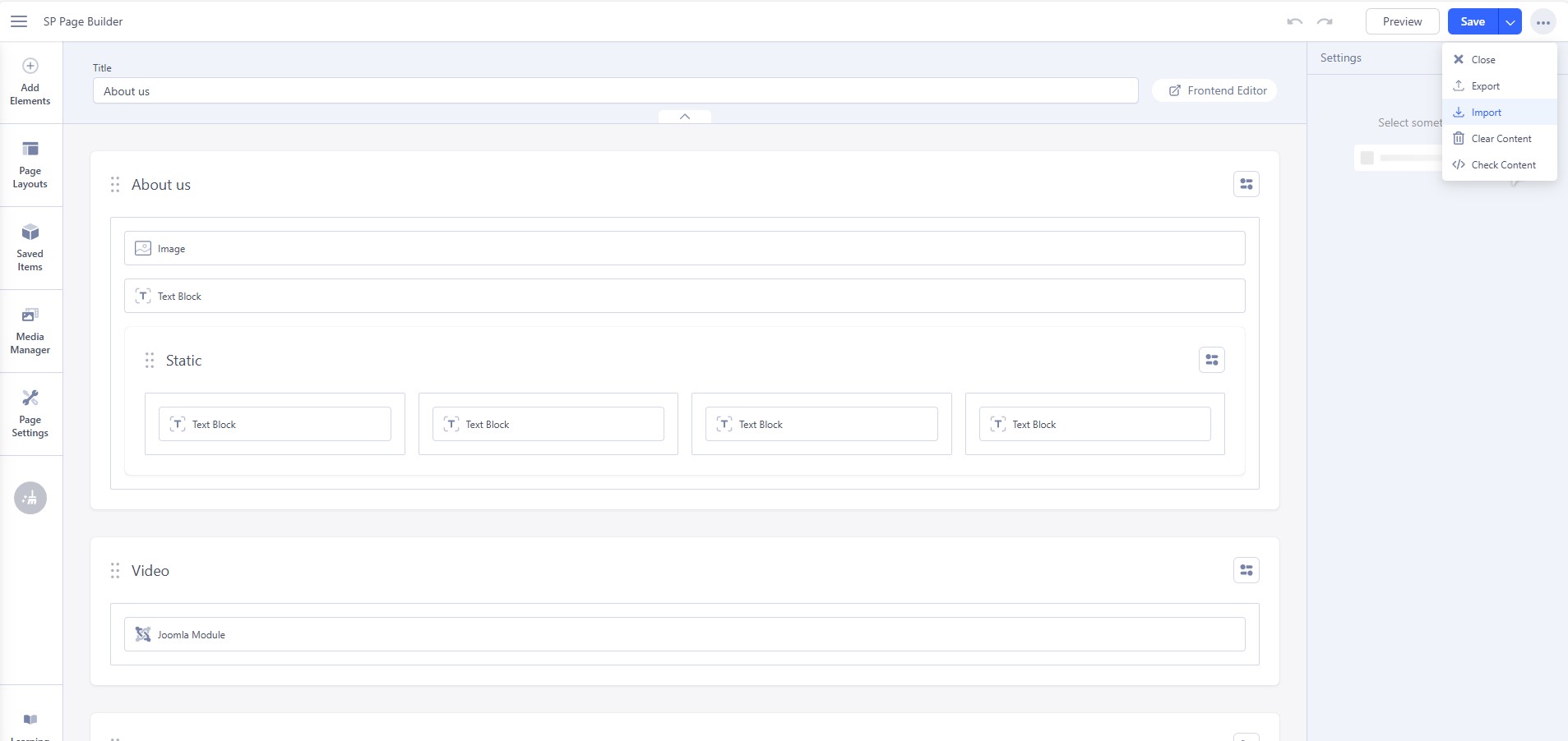 Then create the contact us page and import page. Please go to Components => SP Page builder => Click New button => Enter the Title: "About us"