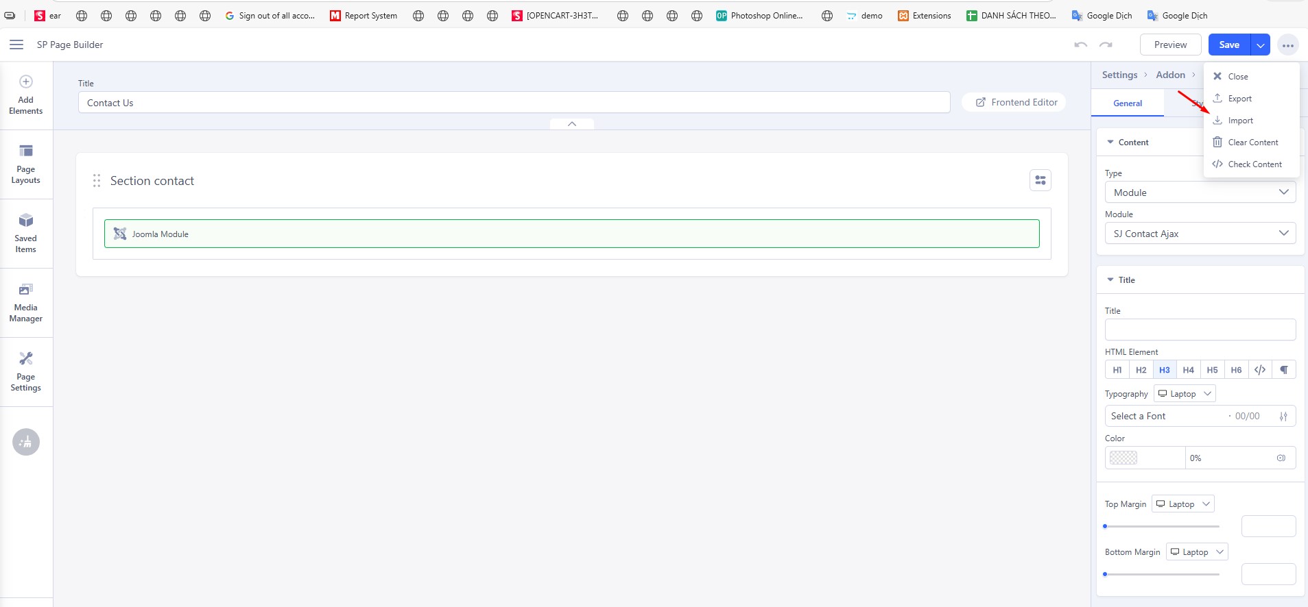 Then create the contact us page and import page. Please go to Components => SP Page builder => Click New button => Enter the Title: "Contact us"