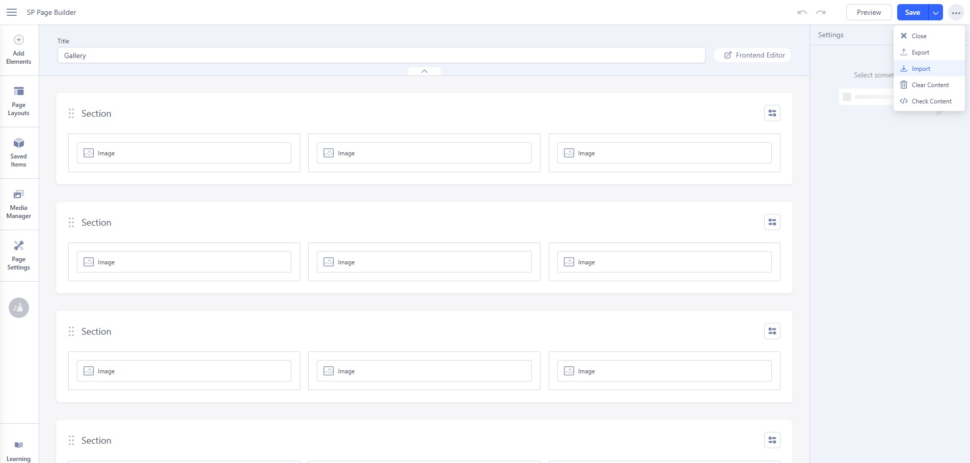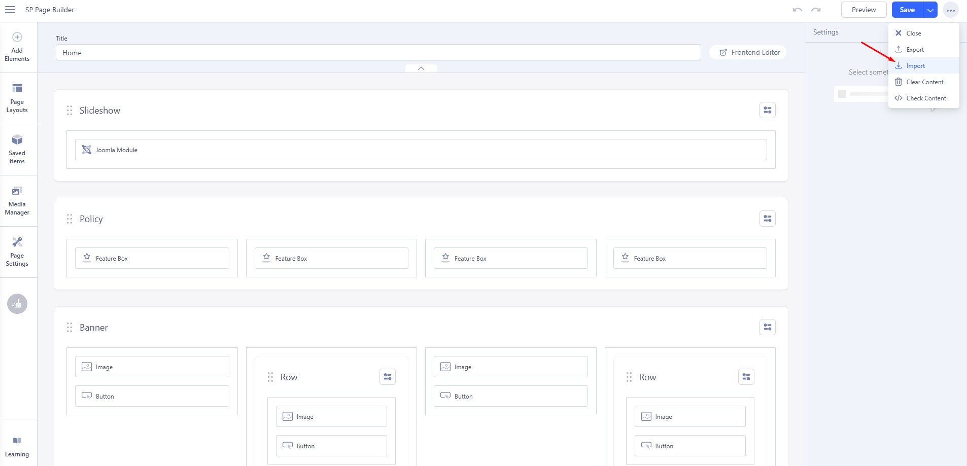 Then create the home page and import page. Please go to Components => SP Page builder => Click New button => Enter the Title: "Home"