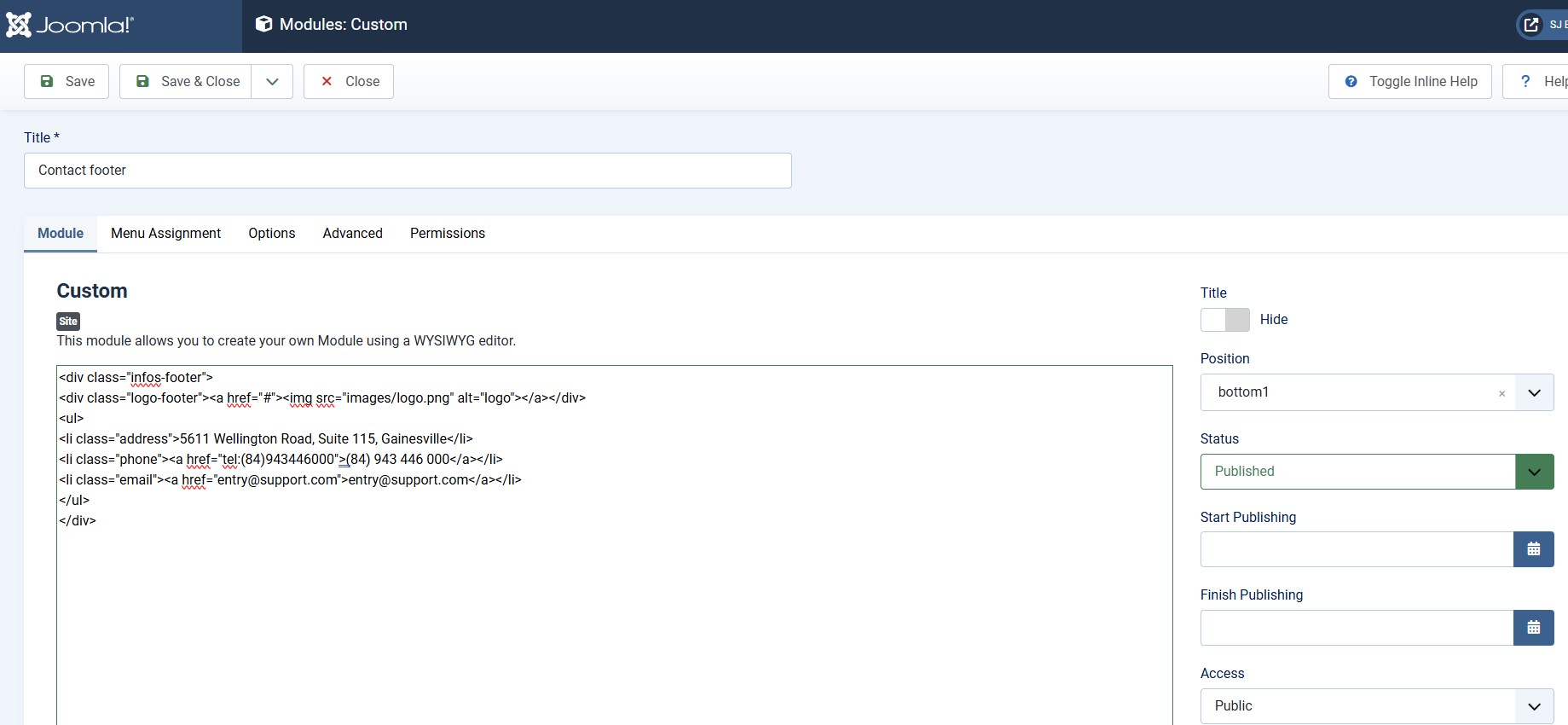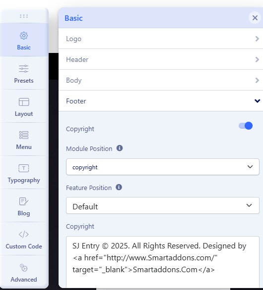 Please go to System/Templates/Site Template Styles/sj-entry => Templates Options/Basic tab => Footer