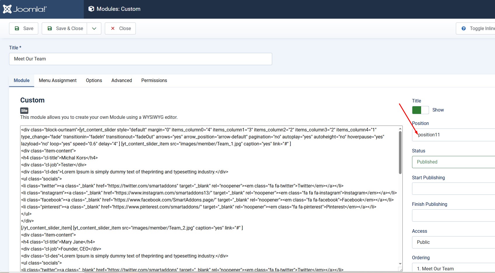 <div class="block-ourteam">[yt_content_slider style="default" margin="0" items_column0="4" items_column1="3" items_column2="2" items_column3="2" items_column4="1" type_change="fade" transitionin="fadeIn" transitionout="fadeOut" arrows="yes" arrow_position="arrow-default" pagination="no" autoplay="yes" autoheight="no" hoverpause="yes" lazyload="no" loop="yes" speed="0.6" delay="4" ] [yt_content_slider_item src="images/member/Team_1.jpg" caption="yes" link="#" ] <div class="item-content"> <h4 class="cl-title">Michal Kors</h4> <div class="cl-job">Tester</div> <div class="cl-des">Lorem Ipsum is simply dummy text of theprinting and typesetting industry.</div> <ul class="socials"> <li class="twitter"><a class="_blank" href="https://twitter.com/smartaddons" target="_blank" rel="noopener"><em class="fa fa-twitter">Twitter</em></a></li> <li class="instagram"><a class="_blank" href="https://www.instagram.com/smartaddons13/" target="_blank" rel="noopener"><em class="fa fa fa-instagram">Instagram</em></a></li> <li class="facebook"><a class="_blank" href="https://www.facebook.com/SmartAddons.page/" target="_blank" rel="noopener"><em class="fa fa-facebook">Facebook</em></a></li> <li class="pinterest"><a class="_blank" href="https://www.pinterest.com/smartaddons/" target="_blank" rel="noopener"><em class="fa fa-pinterest">Pinterest</em></a></li> </ul> </div> [/yt_content_slider_item] [yt_content_slider_item src="images/member/Team_2.jpg" caption="yes" link="#" ] <div class="item-content"> <h4 class="cl-title">Mary Jane</h4> <div class="cl-job">Founder, CEO</div> <div class="cl-des">Lorem Ipsum is simply dummy text of theprinting and typesetting industry.</div> <ul class="socials"> <li class="twitter"><a class="_blank" href="https://twitter.com/smartaddons" target="_blank" rel="noopener"><em class="fa fa-twitter">Twitter</em></a></li> <li class="instagram"><a class="_blank" href="https://www.instagram.com/smartaddons13/" target="_blank" rel="noopener"><em class="fa fa fa-instagram">Instagram</em></a></li> <li class="facebook"><a class="_blank" href="https://www.facebook.com/SmartAddons.page/" target="_blank" rel="noopener"><em class="fa fa-facebook">Facebook</em></a></li> <li class="pinterest"><a class="_blank" href="https://www.pinterest.com/smartaddons/" target="_blank" rel="noopener"><em class="fa fa-pinterest">Pinterest</em></a></li> </ul> </div> [/yt_content_slider_item] [yt_content_slider_item src="images/member/Team_3.jpg" caption="yes" link="#" ] <div class="item-content"> <h4 class="cl-title">John Lemeo</h4> <div class="cl-job">Art Director</div> <div class="cl-des">Lorem Ipsum is simply dummy text of theprinting and typesetting industry.</div> <ul class="socials"> <li class="twitter"><a class="_blank" href="https://twitter.com/smartaddons" target="_blank" rel="noopener"><em class="fa fa-twitter">Twitter</em></a></li> <li class="instagram"><a class="_blank" href="https://www.instagram.com/smartaddons13/" target="_blank" rel="noopener"><em class="fa fa fa-instagram">Instagram</em></a></li> <li class="facebook"><a class="_blank" href="https://www.facebook.com/SmartAddons.page/" target="_blank" rel="noopener"><em class="fa fa-facebook">Facebook</em></a></li> <li class="pinterest"><a class="_blank" href="https://www.pinterest.com/smartaddons/" target="_blank" rel="noopener"><em class="fa fa-pinterest">Pinterest</em></a></li> </ul> </div> [/yt_content_slider_item] [yt_content_slider_item src="images/member/Team_4.jpg" caption="yes" link="#" ] <div class="item-content"> <h4 class="cl-title">Jennifer lawrence</h4> <div class="cl-job">Dev Leader</div> <div class="cl-des">Lorem Ipsum is simply dummy text of theprinting and typesetting industry.</div> <ul class="socials"> <li class="twitter"><a class="_blank" href="https://twitter.com/smartaddons" target="_blank" rel="noopener"><em class="fa fa-twitter">Twitter</em></a></li> <li class="instagram"><a class="_blank" href="https://www.instagram.com/smartaddons13/" target="_blank" rel="noopener"><em class="fa fa fa-instagram">Instagram</em></a></li> <li class="facebook"><a class="_blank" href="https://www.facebook.com/SmartAddons.page/" target="_blank" rel="noopener"><em class="fa fa-facebook">Facebook</em></a></li> <li class="pinterest"><a class="_blank" href="https://www.pinterest.com/smartaddons/" target="_blank" rel="noopener"><em class="fa fa-pinterest">Pinterest</em></a></li> </ul> </div> [/yt_content_slider_item] [yt_content_slider_item src="images/member/Team_5.jpg" caption="yes" link="#" ] <div class="item-content"> <h4 class="cl-title">Alice Crowheart</h4> <div class="cl-job">Designer</div> <div class="cl-des">Lorem Ipsum is simply dummy text of theprinting and typesetting industry.</div> <ul class="socials"> <li class="twitter"><a class="_blank" href="https://twitter.com/smartaddons" target="_blank" rel="noopener"><em class="fa fa-twitter">Twitter</em></a></li> <li class="instagram"><a class="_blank" href="https://www.instagram.com/smartaddons13/" target="_blank" rel="noopener"><em class="fa fa fa-instagram">Instagram</em></a></li> <li class="facebook"><a class="_blank" href="https://www.facebook.com/SmartAddons.page/" target="_blank" rel="noopener"><em class="fa fa-facebook">Facebook</em></a></li> <li class="pinterest"><a class="_blank" href="https://www.pinterest.com/smartaddons/" target="_blank" rel="noopener"><em class="fa fa-pinterest">Pinterest</em></a></li> </ul> </div> [/yt_content_slider_item] [/yt_content_slider]</div>
