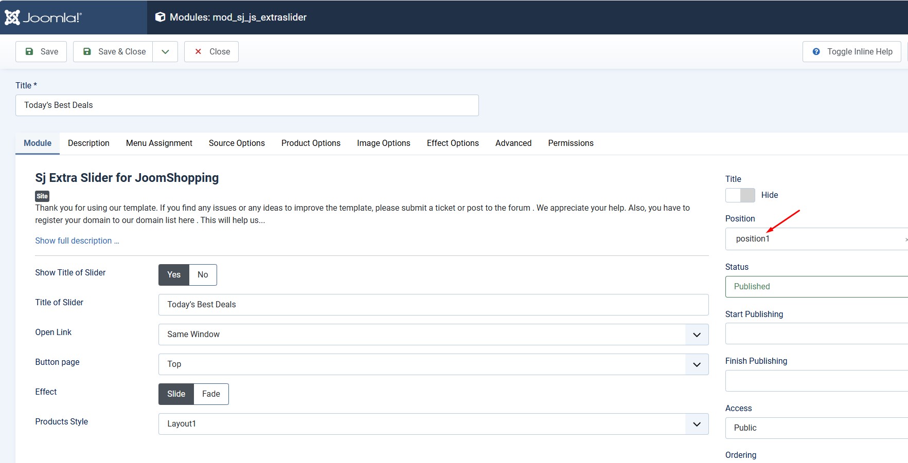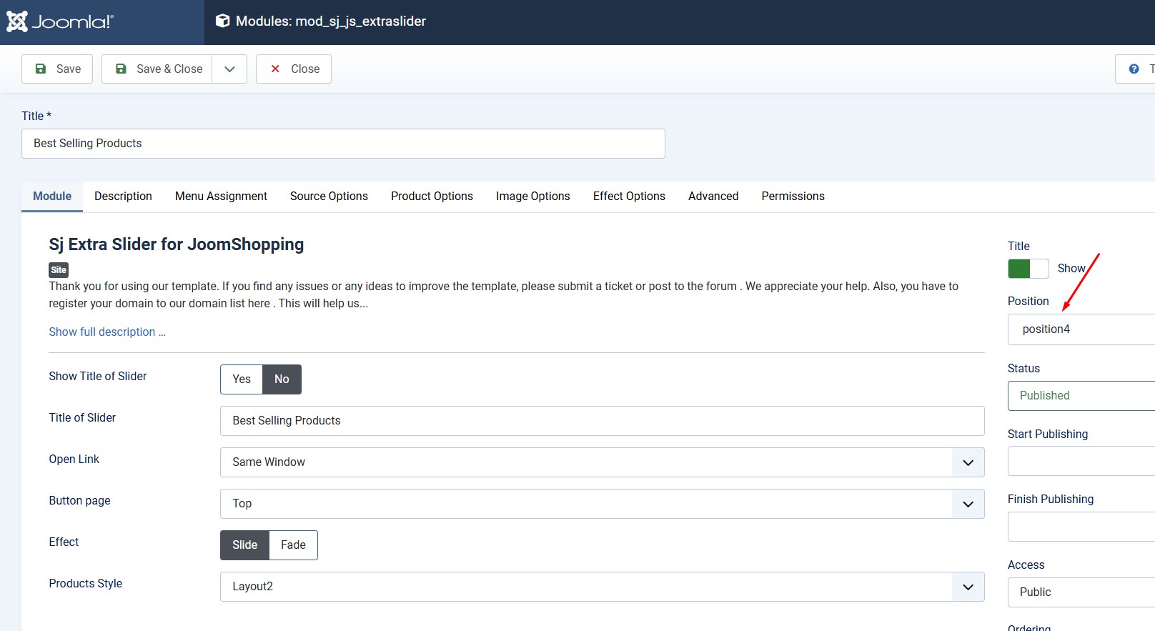 Please go to System/Manage/Site Modules => Click New button to create a new module => Select Sj Extra Slider for JoomShopping module.