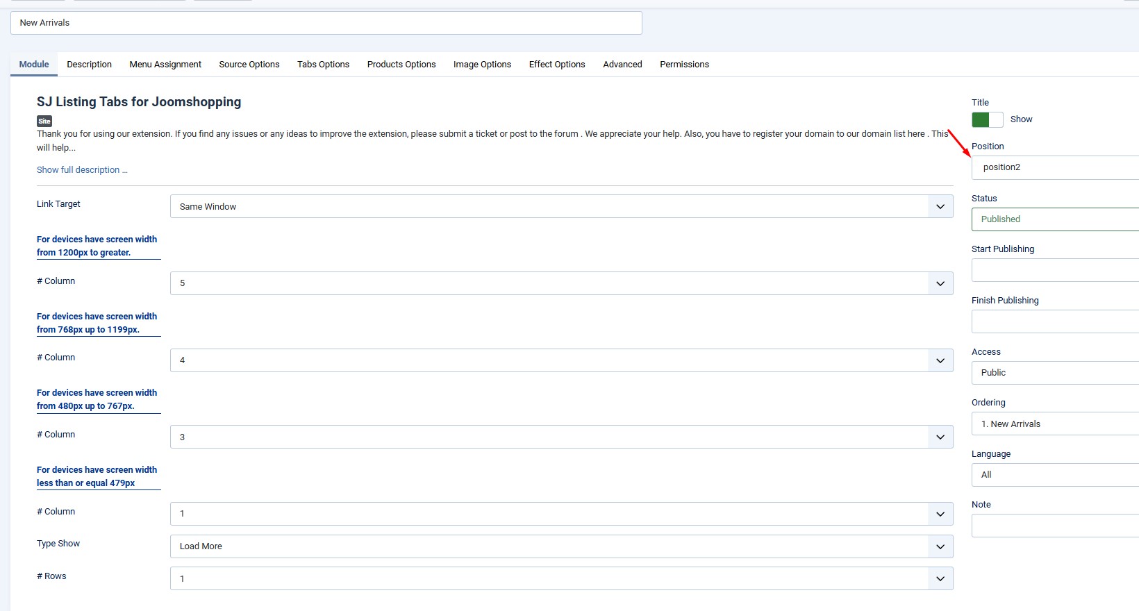 Please go to System/Manage/Site Modules => Click New button to create a new module => Select SJ Listing Tabs for Joomshopping module.