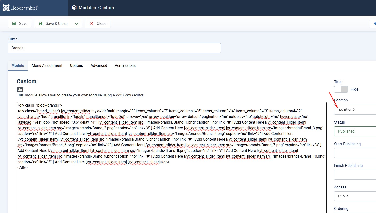<div class="block-brands"> <div class="brand_slider">[yt_content_slider style="default" margin="0" items_column0="7" items_column1="6" items_column2="4" items_column3="3" items_column4="2" type_change="fade" transitionin="fadeIn" transitionout="fadeOut" arrows="yes" arrow_position="arrow-default" pagination="no" autoplay="no" autoheight="no" hoverpause="no" lazyload="yes" loop="no" speed="0.6" delay="4" ] [yt_content_slider_item src="images/brands/Brand_1.png" caption="no" link="#" ] Add Content Here [/yt_content_slider_item] [yt_content_slider_item src="images/brands/Brand_2.png" caption="no" link="#" ] Add Content Here [/yt_content_slider_item] [yt_content_slider_item src="images/brands/Brand_3.png" caption="no" link="#" ] Add Content Here [/yt_content_slider_item] [yt_content_slider_item src="images/brands/Brand_4.png" caption="no" link="#" ] Add Content Here [/yt_content_slider_item] [yt_content_slider_item src="images/brands/Brand_5.png" caption="no" link="#" ] Add Content Here [/yt_content_slider_item] [yt_content_slider_item src="images/brands/Brand_6.png" caption="no" link="#" ] Add Content Here [/yt_content_slider_item] [yt_content_slider_item src="images/brands/Brand_7.png" caption="no" link="#" ] Add Content Here [/yt_content_slider_item] [yt_content_slider_item src="images/brands/Brand_8.png" caption="no" link="#" ] Add Content Here [/yt_content_slider_item] [yt_content_slider_item src="images/brands/Brand_9.png" caption="no" link="#" ] Add Content Here [/yt_content_slider_item] [yt_content_slider_item src="images/brands/Brand_10.png" caption="no" link="#" ] Add Content Here [/yt_content_slider_item] [/yt_content_slider]</div> </div>