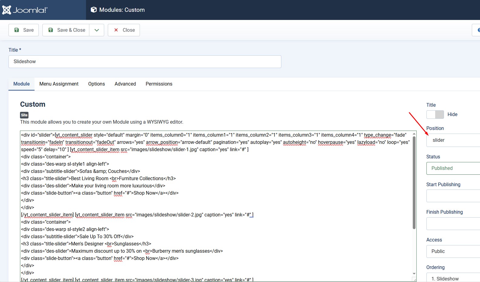 <div id="slider">[yt_content_slider style="default" margin="0" items_column0="1" items_column1="1" items_column2="1" items_column3="1" items_column4="1" type_change="fade" transitionin="fadeIn" transitionout="fadeOut" arrows="yes" arrow_position="arrow-default" pagination="yes" autoplay="yes" autoheight="no" hoverpause="yes" lazyload="no" loop="yes" speed="5" delay="10" ] [yt_content_slider_item src="images/slideshow/slider-1.jpg" caption="yes" link="#" ] <div class="container"> <div class="des-warp sl-style1 align-left"> <div class="subtitle-slider">Sofas & Couches</div> <h3 class="title-slider">Best Living Room <br>Furniture Collections</h3> <div class="des-slider">Make your living room more luxurious</div> <div class="slide-button"><a class="button" href="#">Shop Now</a></div> </div> </div> [/yt_content_slider_item] [yt_content_slider_item src="images/slideshow/slider-2.jpg" caption="yes" link="#" ] <div class="container"> <div class="des-warp sl-style2 align-left"> <div class="subtitle-slider">Sale Up To 30% Off</div> <h3 class="title-slider">Men's Designer <br>Sunglasses</h3> <div class="des-slider">Maximum discount up to 30% on <br>Burberry men's sunglasses</div> <div class="slide-button"><a class="button" href="#">Shop Now</a></div> </div> </div> [/yt_content_slider_item] [yt_content_slider_item src="images/slideshow/slider-3.jpg" caption="yes" link="#" ] <div class="container"> <div class="des-warp sl-style3 align-left"> <div class="subtitle-slider">New Arrivals</div> <h3 class="title-slider">Women's Sterling <br>Silver Jewelry</h3> <div class="des-slider">Three-piece women's jewelry set <br>made entirely from pure silver</div> <div class="slide-button"><a class="button" href="#">Shop Now</a></div> </div> </div> [/yt_content_slider_item][/yt_content_slider]</div>